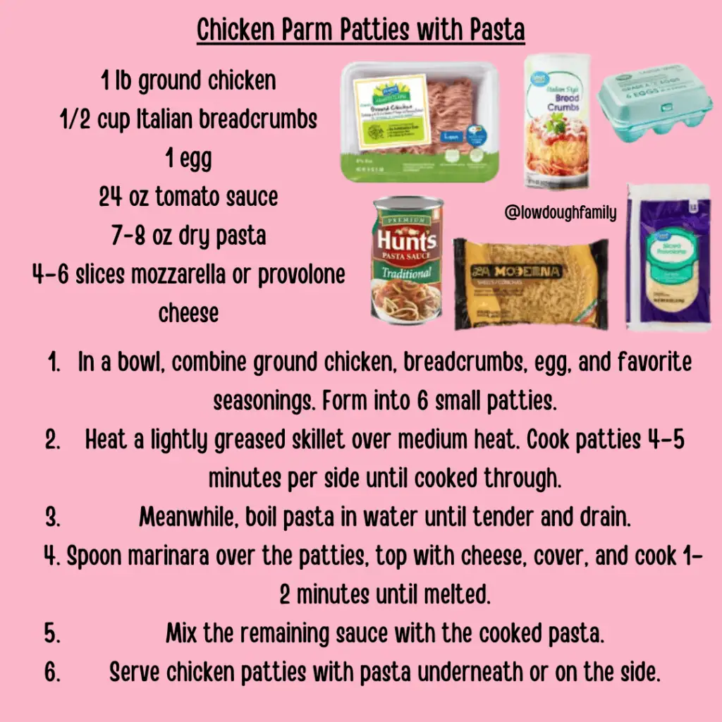 These skillet-cooked chicken patties are topped with marinara and melty cheese, then served alongside pasta for a comforting, budget-friendly dinner. Swap ground turkey for chicken, use any short pasta you have on hand, or skip the cheese slices and sprinkle shredded cheese instead.