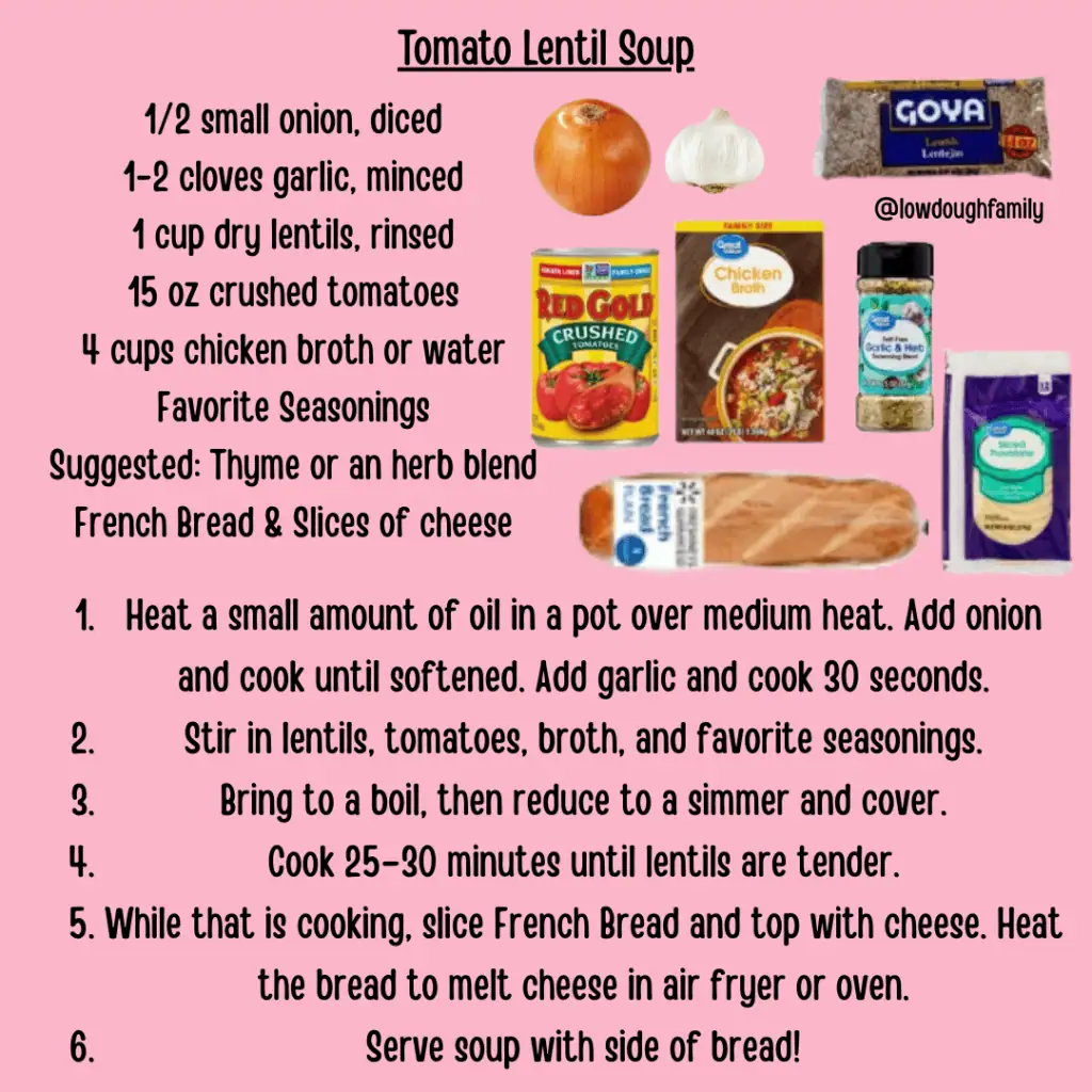 This cozy soup combines lentils and crushed tomatoes into a hearty, filling meal that pairs perfectly with bread and melted cheese on the side. Use water instead of broth, swap thyme for any dried herb blend you like, or add rice or small pasta to stretch it even further.