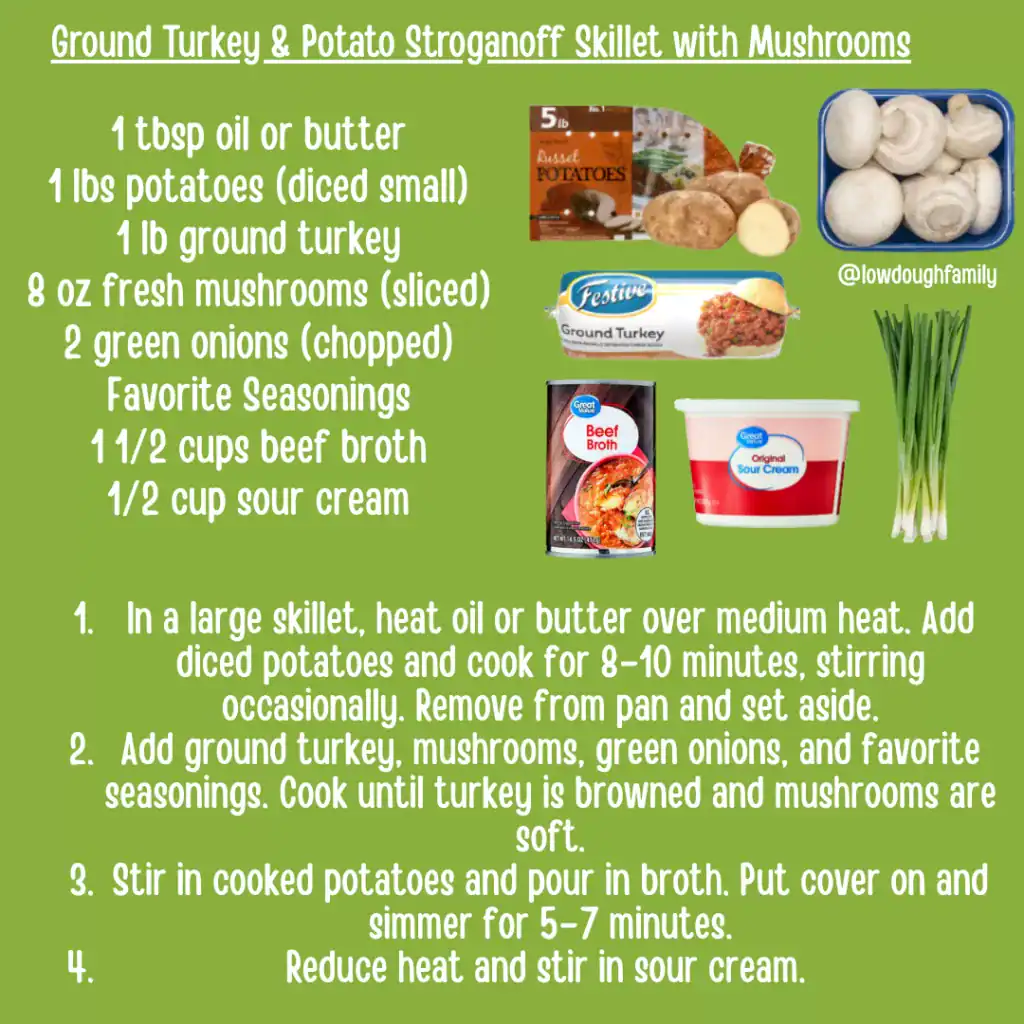 A cozy stovetop meal with ground turkey, potatoes, mushrooms, and a creamy finish. You can swap turkey for ground beef or chicken. Maybe add spinach instead of mushrooms?
