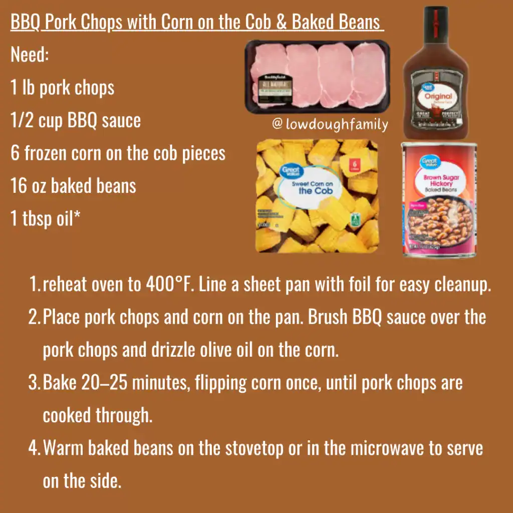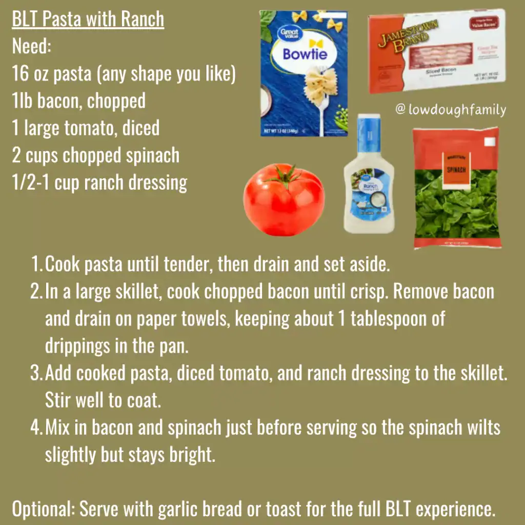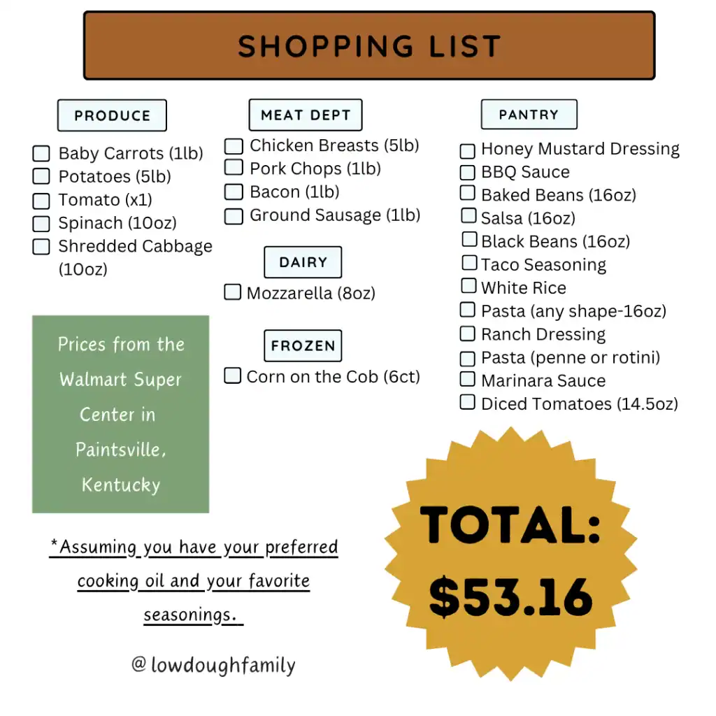 This week’s meal plan is all about keeping things simple but satisfying. Every recipe uses five ingredients or less, takes very little effort, and still brings that cozy comfort we all need this time of year. Our total was just $53.16 at the Paintsville, KY Super Walmart, and as a bonus, most of these ingredients are probably already hanging out in your fridge. Hello BBQ sauce and ranch, we see you!