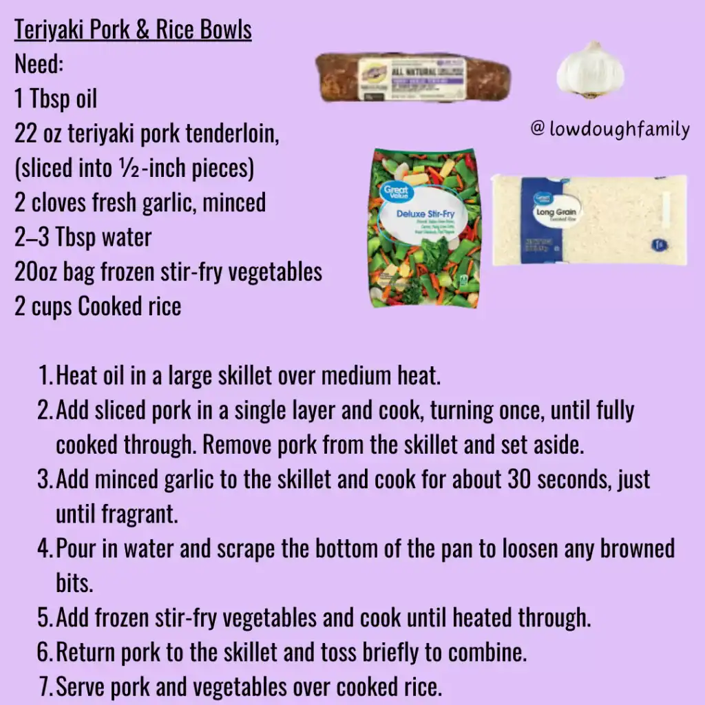 These rice bowls keep things easy with sliced teriyaki pork and stir-fry vegetables cooked together in one pan. If needed, you can swap the veggie blend for frozen broccoli or snap peas, or serve it over noodles instead of rice for a change.