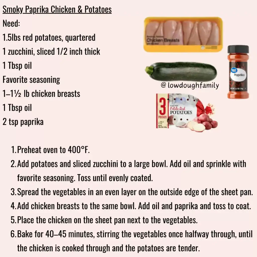 This sheet-pan dinner roasts chicken, potatoes, and zucchini together for a simple but satisfying meal. You can swap the zucchini for another low-cost veggie like carrots or yellow squash, or if not a fan of paprika, you can use any seasoning you like.