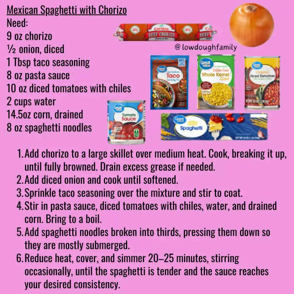 This one-pan pasta combines chorizo, pasta sauce, and tomatoes with chiles for a dinner that feels familiar but a little different. You can swap the corn for black beans, use a different small pasta if spaghetti isn’t available, or adjust the heat level by choosing mild or spicy tomatoes.