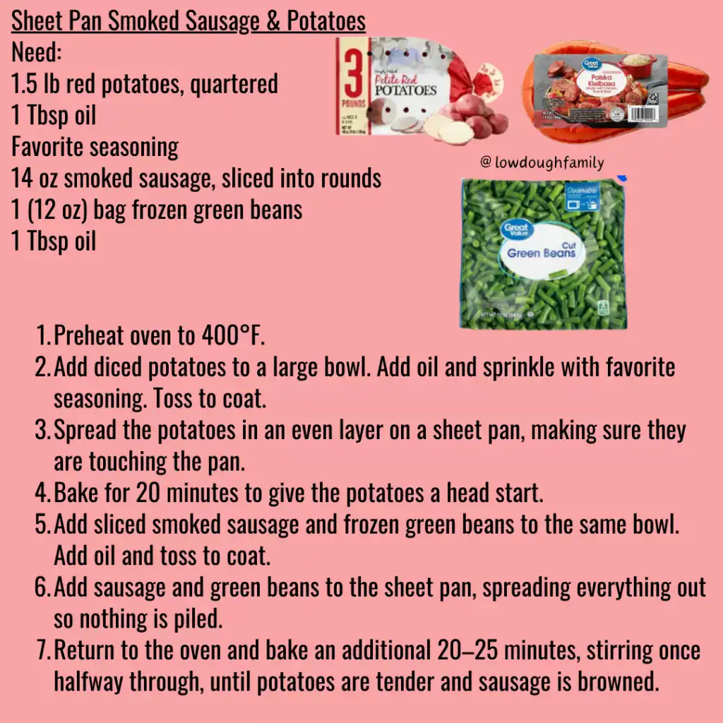 Smoked sausage, potatoes, and green beans roast together for a hearty, no-fuss oven meal. You can swap the green beans for another frozen veggie or use a different smoked sausage flavor to change things up.
