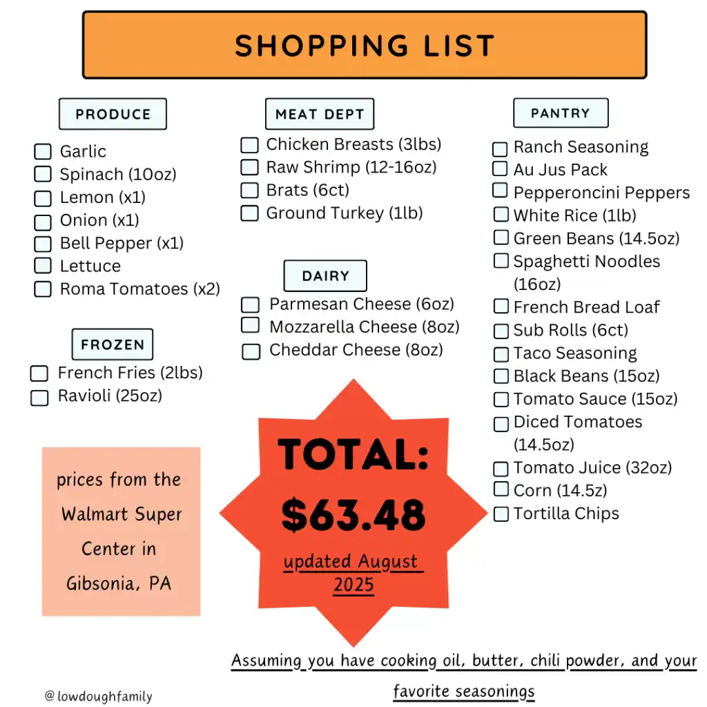 *We updated the prices on this menu in August 2025, and the new total was $63.48. The really wasn’t any big jumps in price for any one item, it was really more of 25 cents here and 20 cents there.