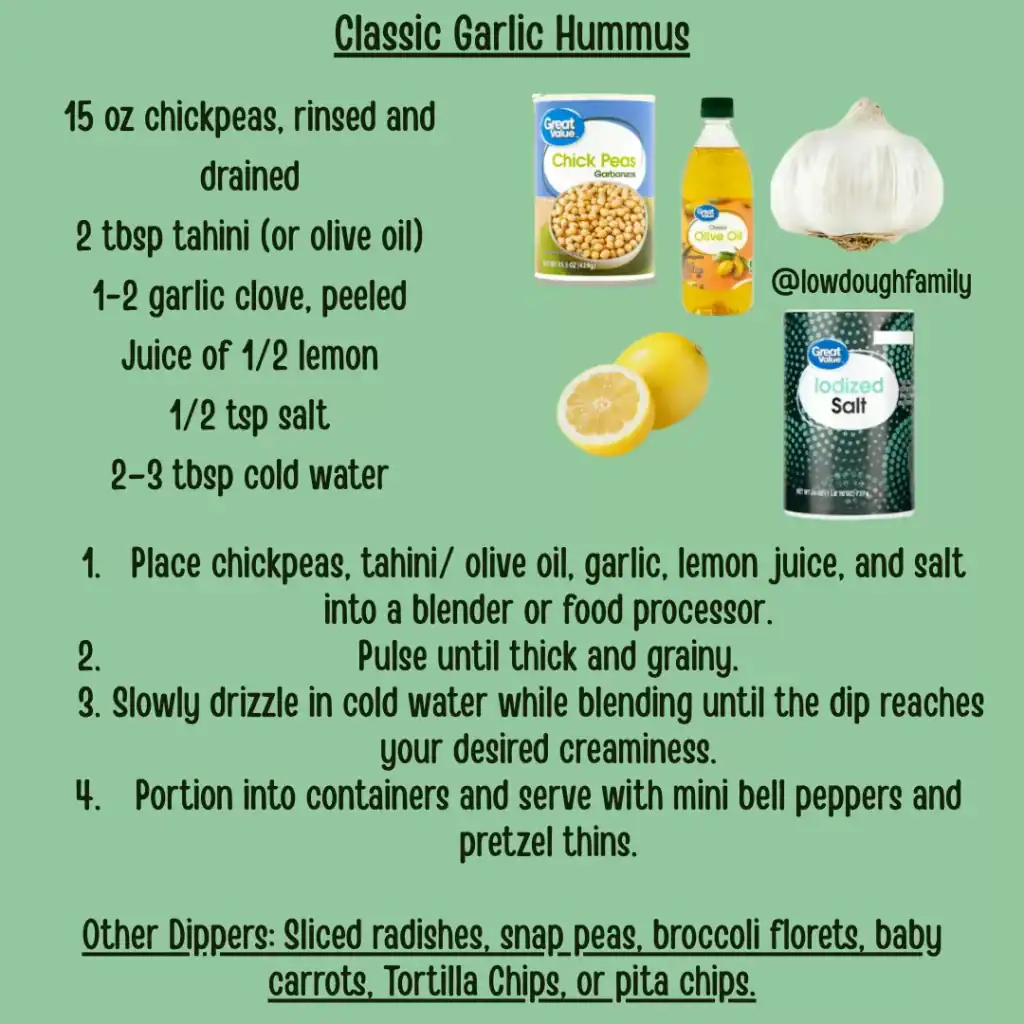 Before you head to the store, take a quick look around your house for dippers you already have hiding in the pantry. Don’t forget to check the produce aisle for those low-cost seasonal veggies on sale to keep your lunch plate fresh, crunchy, and budget-friendly!