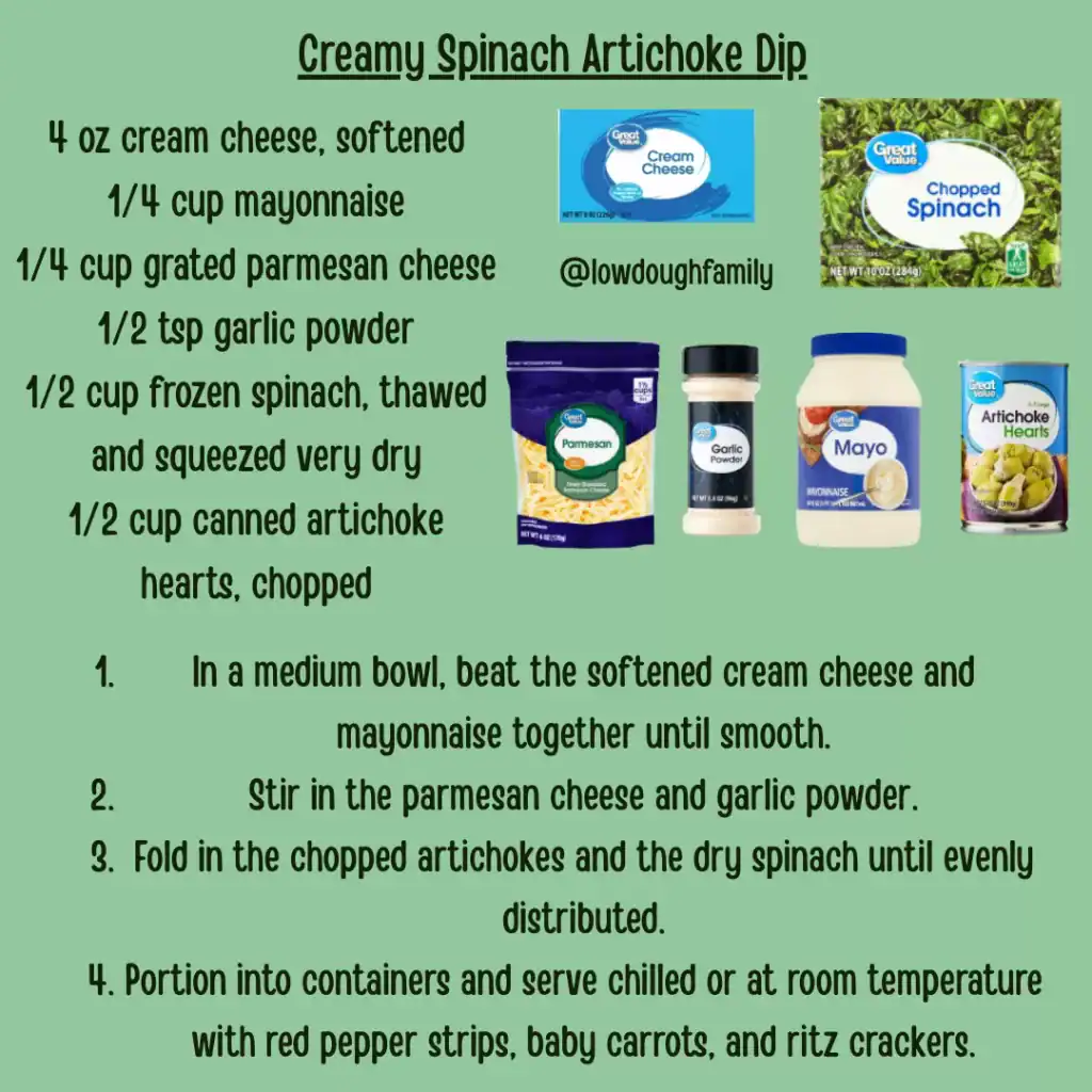 This cold version of the classic appetizer uses frozen spinach and canned artichokes to keep it very affordable. You can swap the mayo for Greek yogurt, and really anything veggie goes great with this dip!