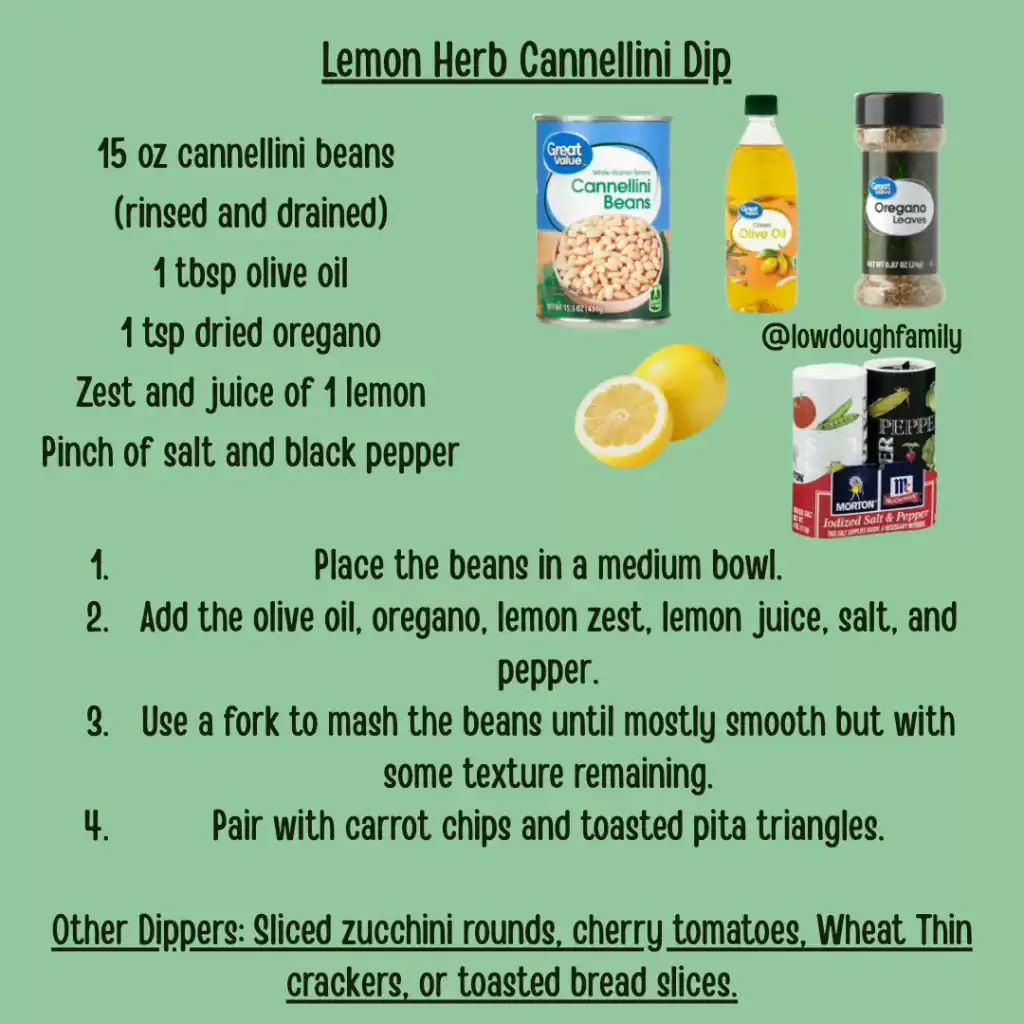This white bean dip is a light, Mediterranean-style lunch that feels much fancier than its low price tag. It pairs perfectly with sliced zucchini rounds, and you can swap the fresh lemon juice for a splash of white vinegar or pickle juice if you are out of citrus.