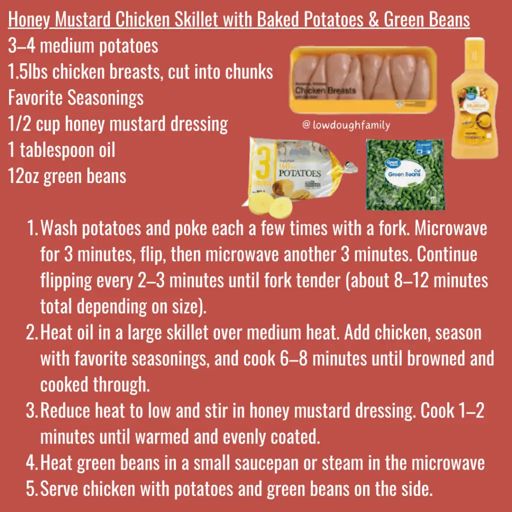 Using bottled honey mustard keeps this meal budget-friendly and quick. The microwave potatoes save time, but you can roast them in the oven or air fryer if you prefer, and any canned or frozen veggie works in place of green beans.