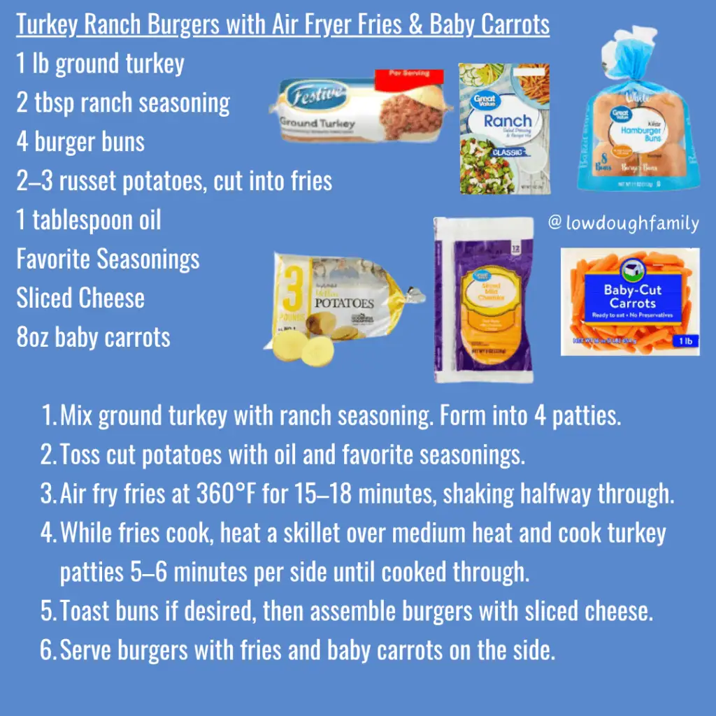 Mixing ranch seasoning into the turkey adds flavor without extra ingredients. If you don’t have an air fryer, the fries can be baked in the oven, and you can swap baby carrots for any easy raw veggie like cucumbers, tomatoes, etc.