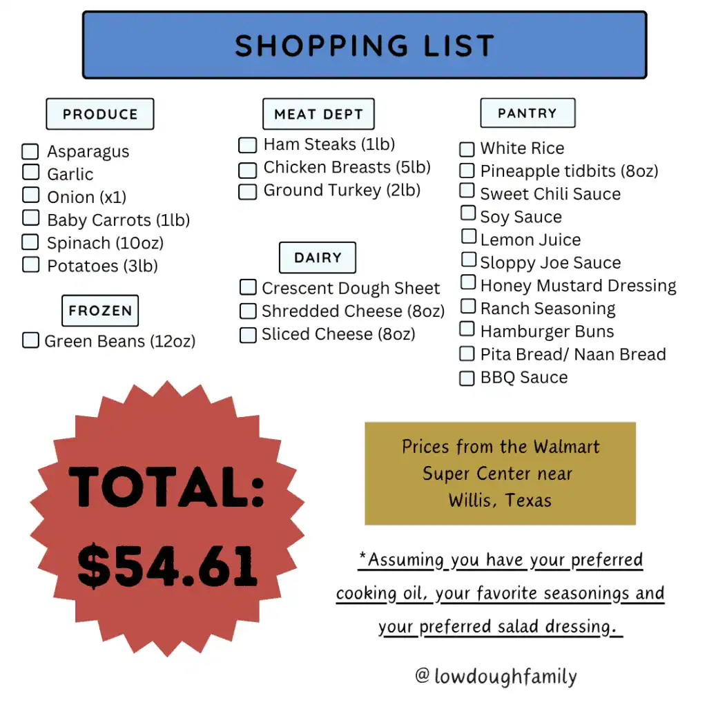 This week, we focused on simple, no-stress meals that don’t take a long list of ingredients or a ton of time to make. Everything is easy to throw together, family-friendly, and made with ingredients you can actually find without hunting all over the store. Our total for 25 items came to $54.61 at the Super Walmart near Willis, Texas, making this a full week of dinners that keeps both time and budget in check.