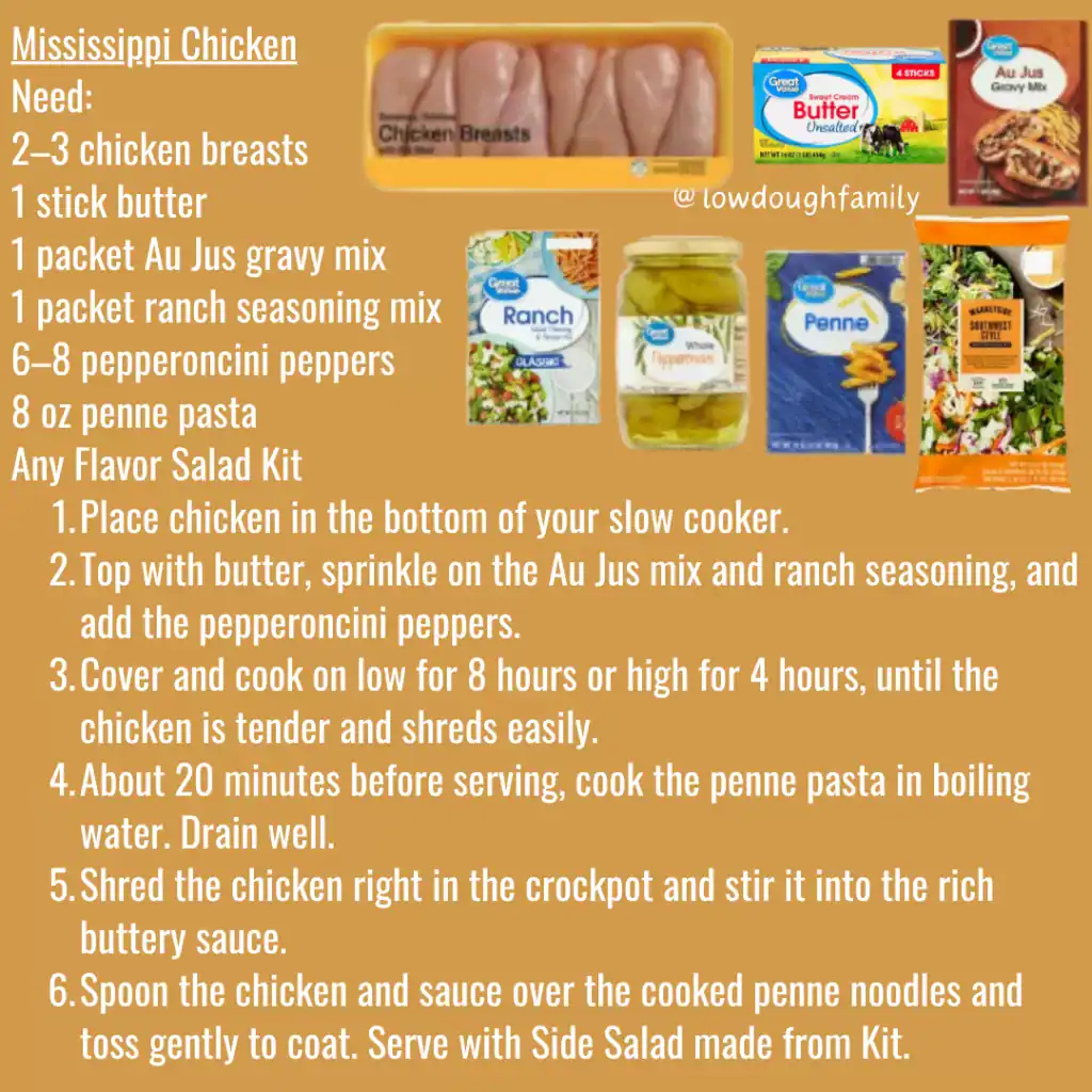 All the buttery, tangy flavors of classic Mississippi roast made budget-friendly with chicken breasts instead of beef. Serve it over tender penne pasta with a salad kit on the side for an easy, balanced meal. Chicken thighs work great here too, and you can use egg noodles if pasta’s on sale.