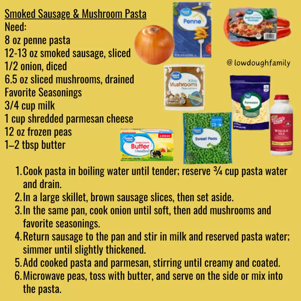 Smoky sausage, mushrooms, and creamy parmesan come together for a cozy pasta dinner that tastes like comfort in a bowl. You can swap the peas for green beans, mixed veggies, or even spinach for a change in flavor.