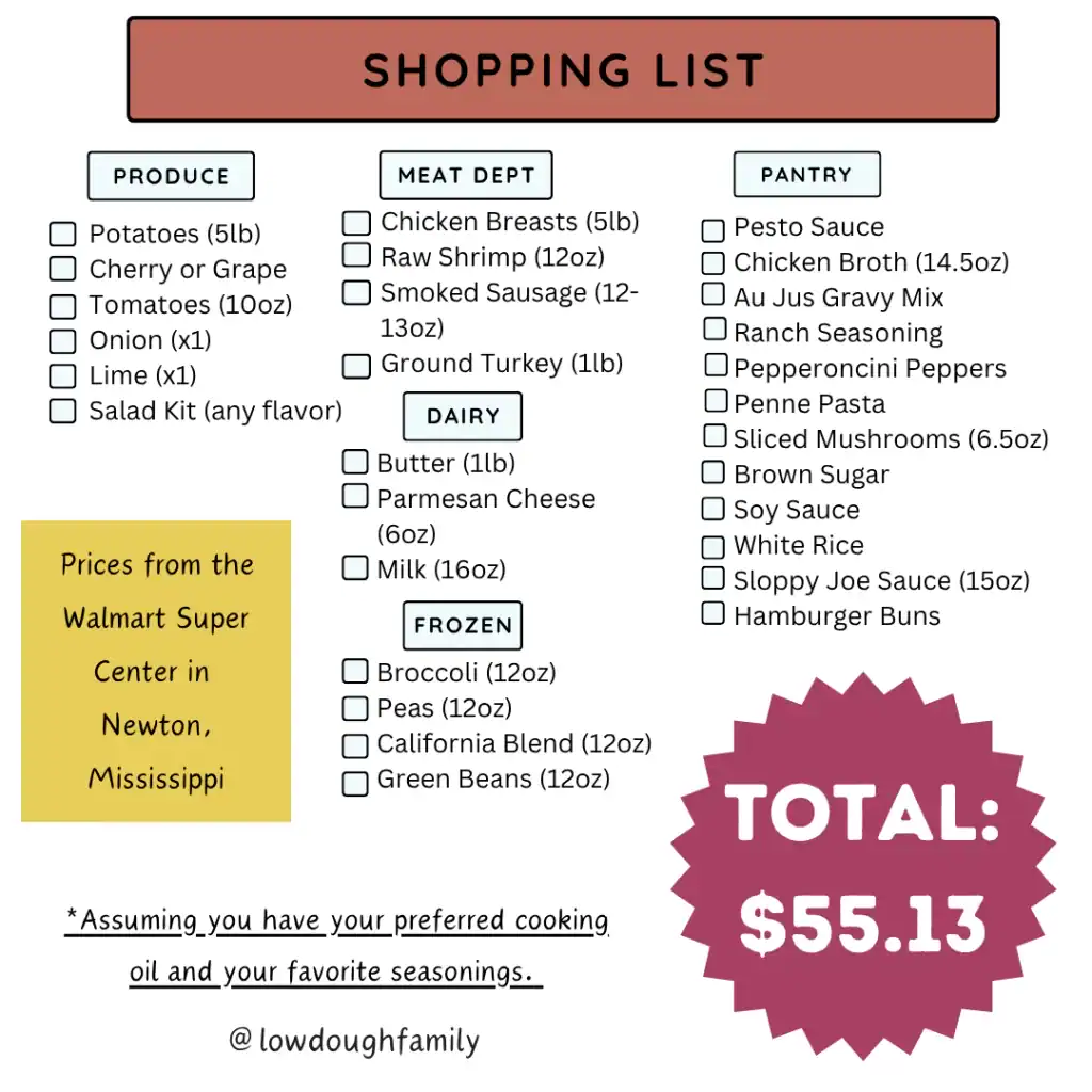 Comfort food doesn’t have to come with a high price tag! With just $55.13 spent on 28 items at the Super Walmart in Newton, MS, this week’s menu includes everything from creamy pastas to tangy slow cooker chicken and even an easy shrimp dinner. These meals are warm, budget-friendly, and perfect for busy weeknights.