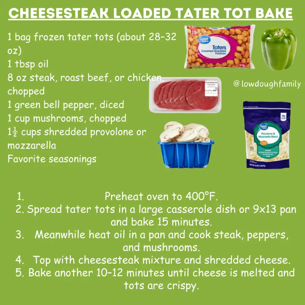 This hearty casserole combines crispy tater tots with classic cheesesteak toppings for a comfort food dinner everyone will love. If you want to stretch it further, add a layer of scrambled eggs or extra veggies like onions or spinach.