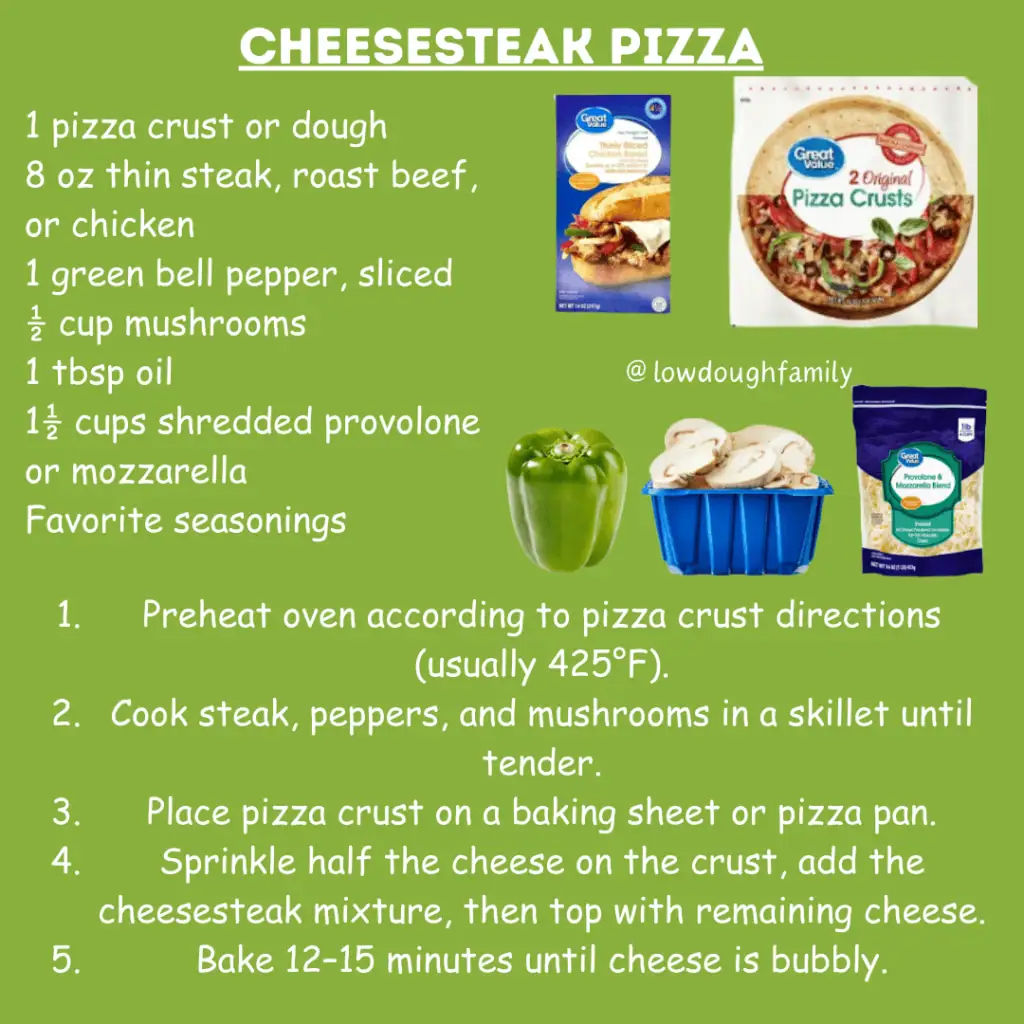 All the flavors of a Philly cheesesteak layered onto a cheesy, crispy crust for an easy family favorite. You can use naan, flatbread, or even French bread instead of traditional pizza dough to keep things quick and budget-friendly. If you like your pizza saucy, try using ranch dressing or alfredo sauce as your base sauce!
