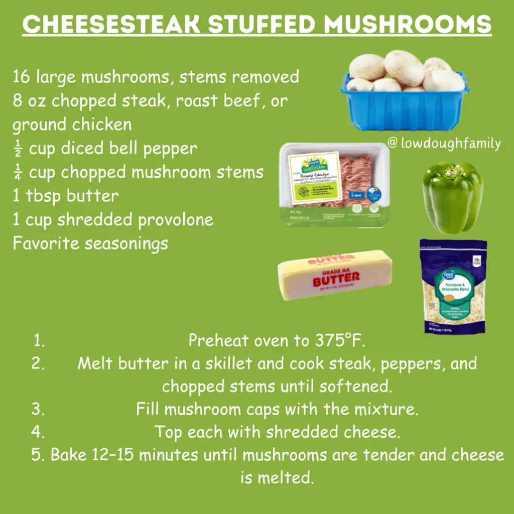 These make a great lighter dinner or appetizer with all the cheesesteak flavor packed into bite-sized portions. If mushrooms aren’t a favorite, this same filling works really well stuffed into hollowed zucchini or even piled onto toasted bread.