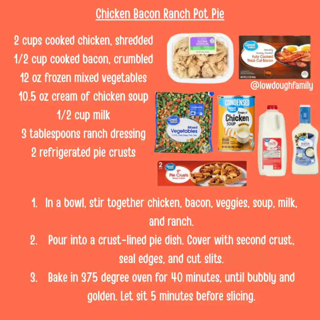 Smoky bacon and ranch dressing give this pot pie a bold flavor your family will love. Turkey bacon or leftover ham work just as well if that’s what you’ve got.