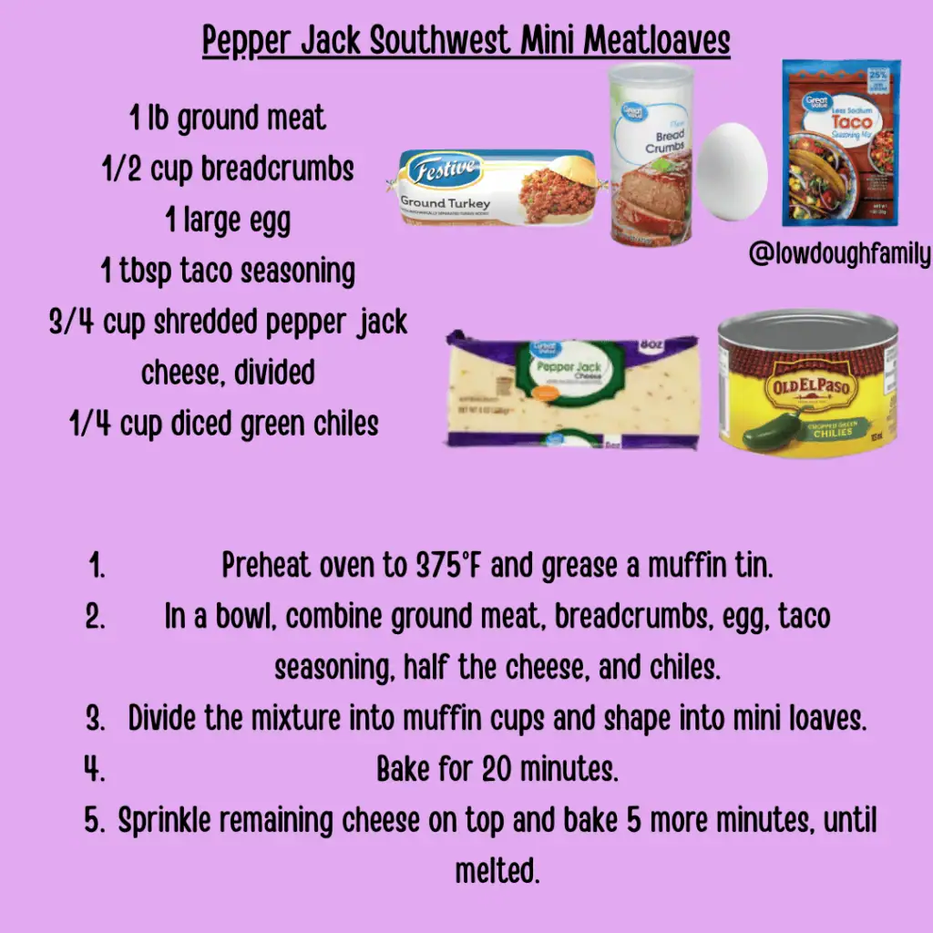 These mini meatloaves bring a little heat with taco seasoning and pepper jack cheese baked right in. Mild cheddar works if you want less spice, and canned corn can be swapped for the diced green chiles!