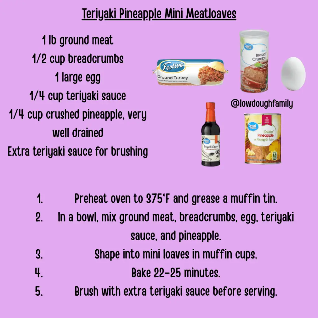 Sweet and savory teriyaki sauce paired with crushed pineapple makes these mini meatloaves a family favorite. Brown sugar and soy sauce can replace bottled teriyaki, and ground chicken works especially well here.
