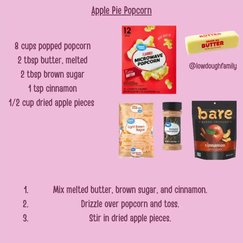 Fluffy popcorn tossed with butter, brown sugar, dried apples, and cinnamon gives you a quick snack with apple pie vibes. Drizzle with white chocolate or caramel for a sweeter version.