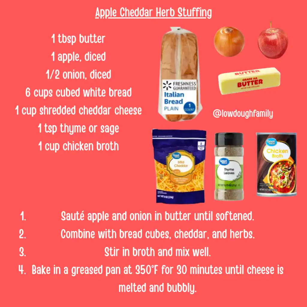 Sharp cheddar and juicy apples give this stuffing a sweet-savory combo that tastes amazing with chicken, turkey, or pork. Swap in Gouda or Colby Jack if cheddar isn’t on hand, or use pears for a fun twist.