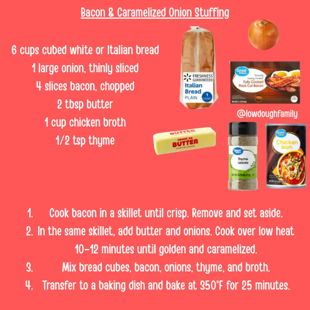 Smoky bacon and sweet caramelized onions turn simple bread cubes into a rich, comforting side that tastes like it simmered all day. Swap yellow onions for sweet onions or use turkey bacon if you prefer a lighter option.