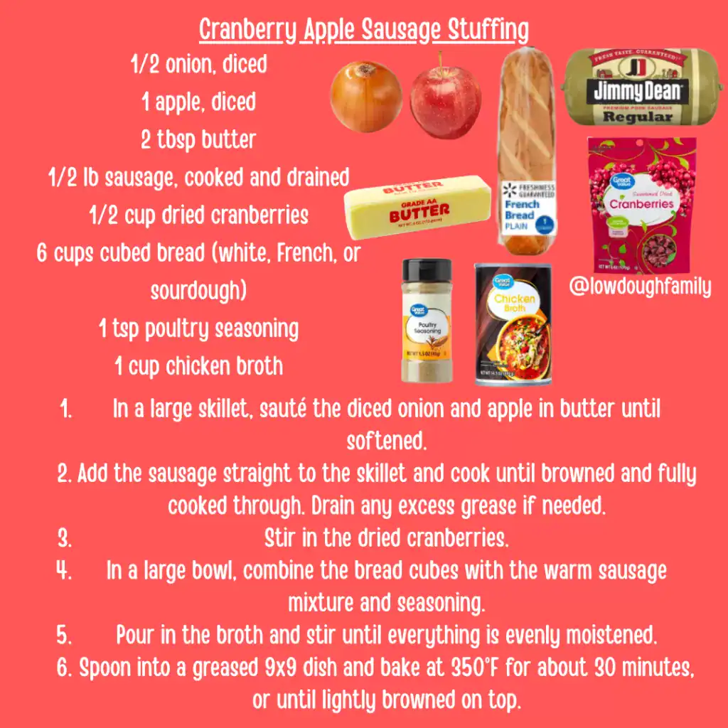 Sweet apples, tart cranberries, and savory sausage make this stuffing feel hearty and balanced, perfect for fall or winter dinners. Try swapping the sausage for turkey sausage or chicken sausage if you want a lighter option.