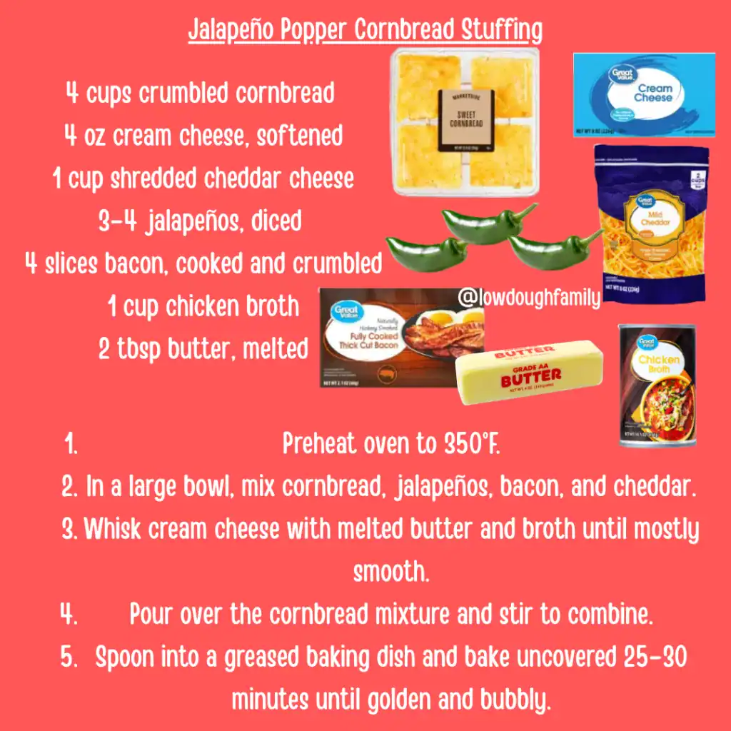 This stuffing brings creamy, cheesy jalapeno popper flavor to classic cornbread, making it spicy, cozy, and crowd-pleasing. You can swap in green chiles for a milder version or use pepper jack instead of cheddar for extra heat.