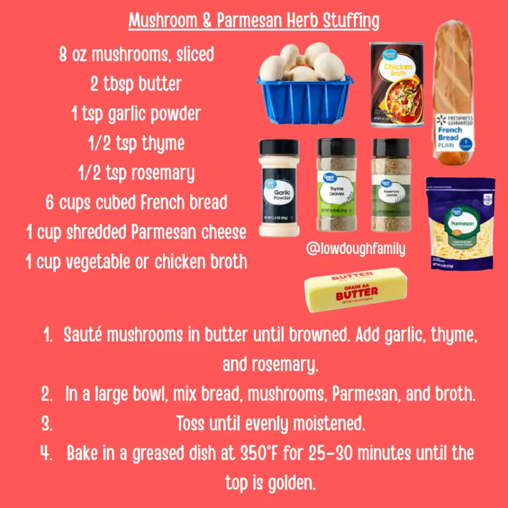 Earthy mushrooms and rich Parmesan give this stuffing a warm, savory flavor that pairs with almost any protein. You can use fresh herbs instead of dried or switch in Asiago or Romano if that’s what you have.