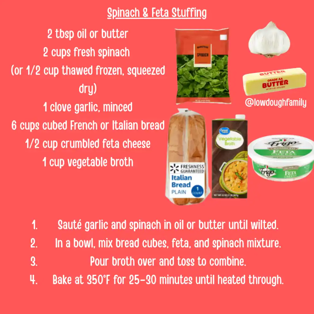 This stuffing has bright, tangy flavors from the feta and a nice pop of color from the spinach, making it feel a little fresher than classic versions. You can use frozen spinach instead of fresh or add a splash of lemon juice for extra brightness.