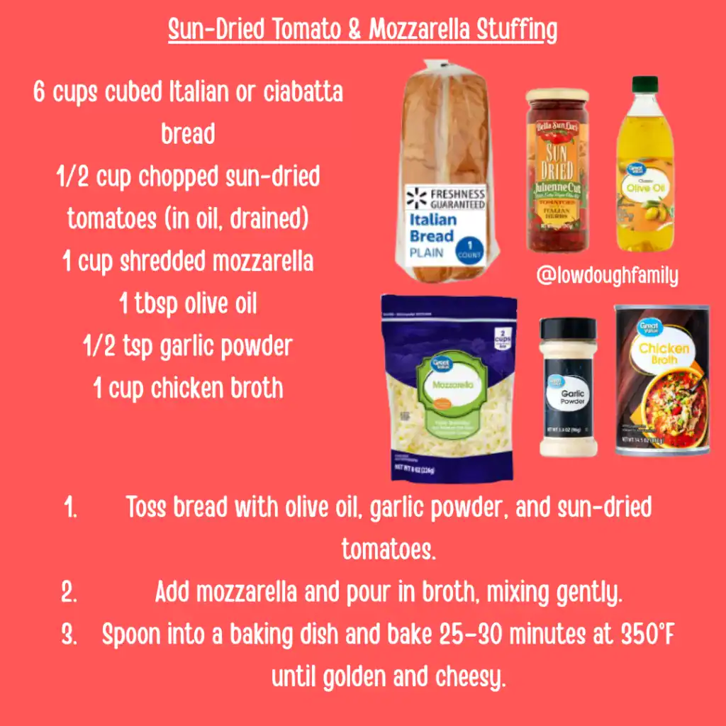 Melty mozzarella and tangy sun-dried tomatoes give this stuffing an Italian flair that feels cozy but still a little fancy. You can use provolone or shredded Italian blend cheese instead of mozzarella or add basil if you want even more flavor.