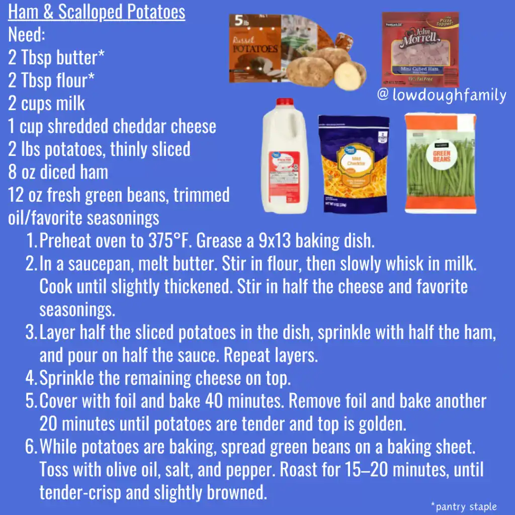 A true comfort classic, creamy scalloped potatoes get an upgrade with savory diced ham and a side of roasted green beans. If you’re short on time, frozen green beans work just as well, or you can swap in peas for something different.