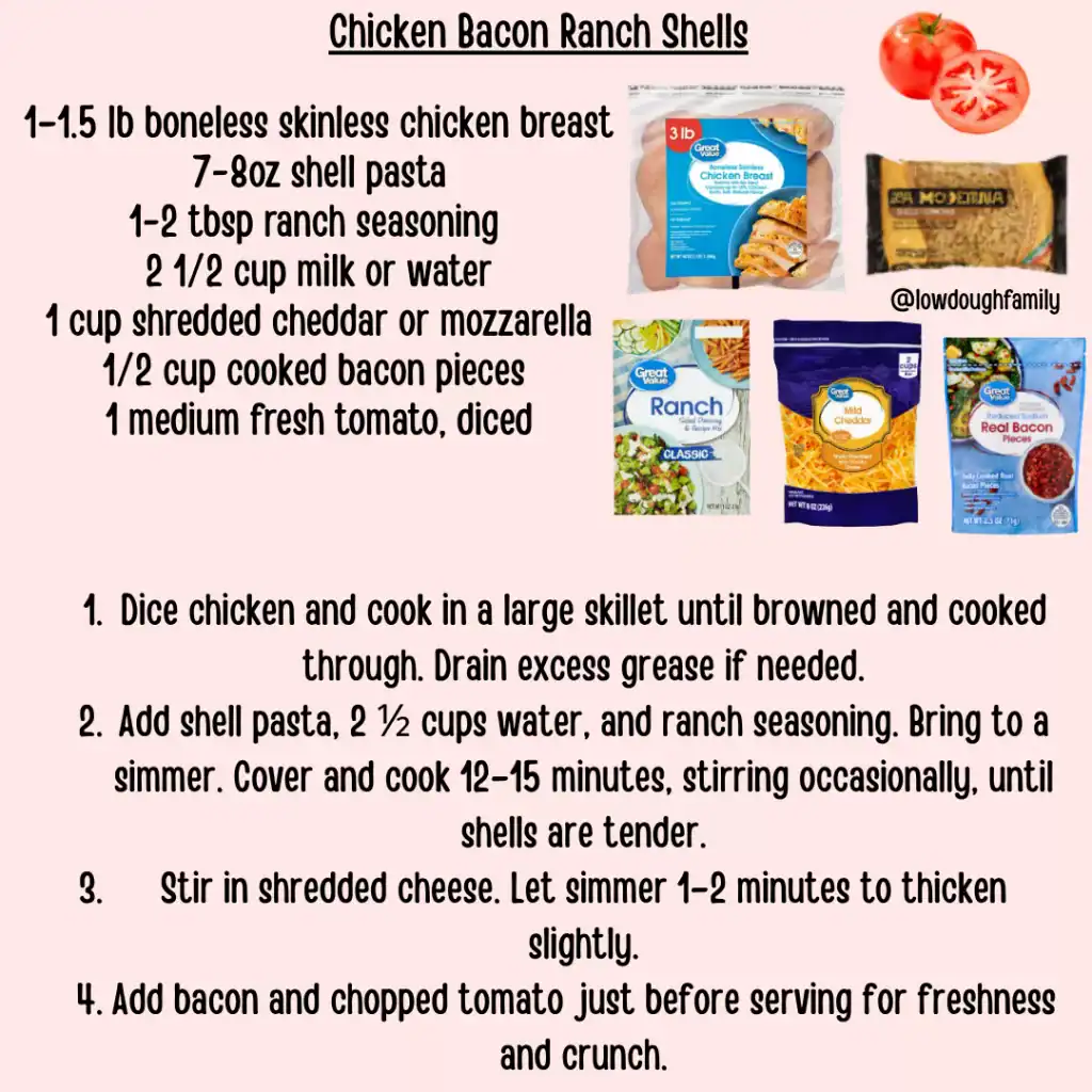 Shell pasta gets tossed with seasoned chicken, creamy ranch flavor, smoky bacon crumbles, and a fresh tomato finish. It’s bold, cheesy, and satisfying plus all in one pan. No tomato? Try spinach or green onion. Want more zing? Add a drizzle of buffalo sauce before serving.