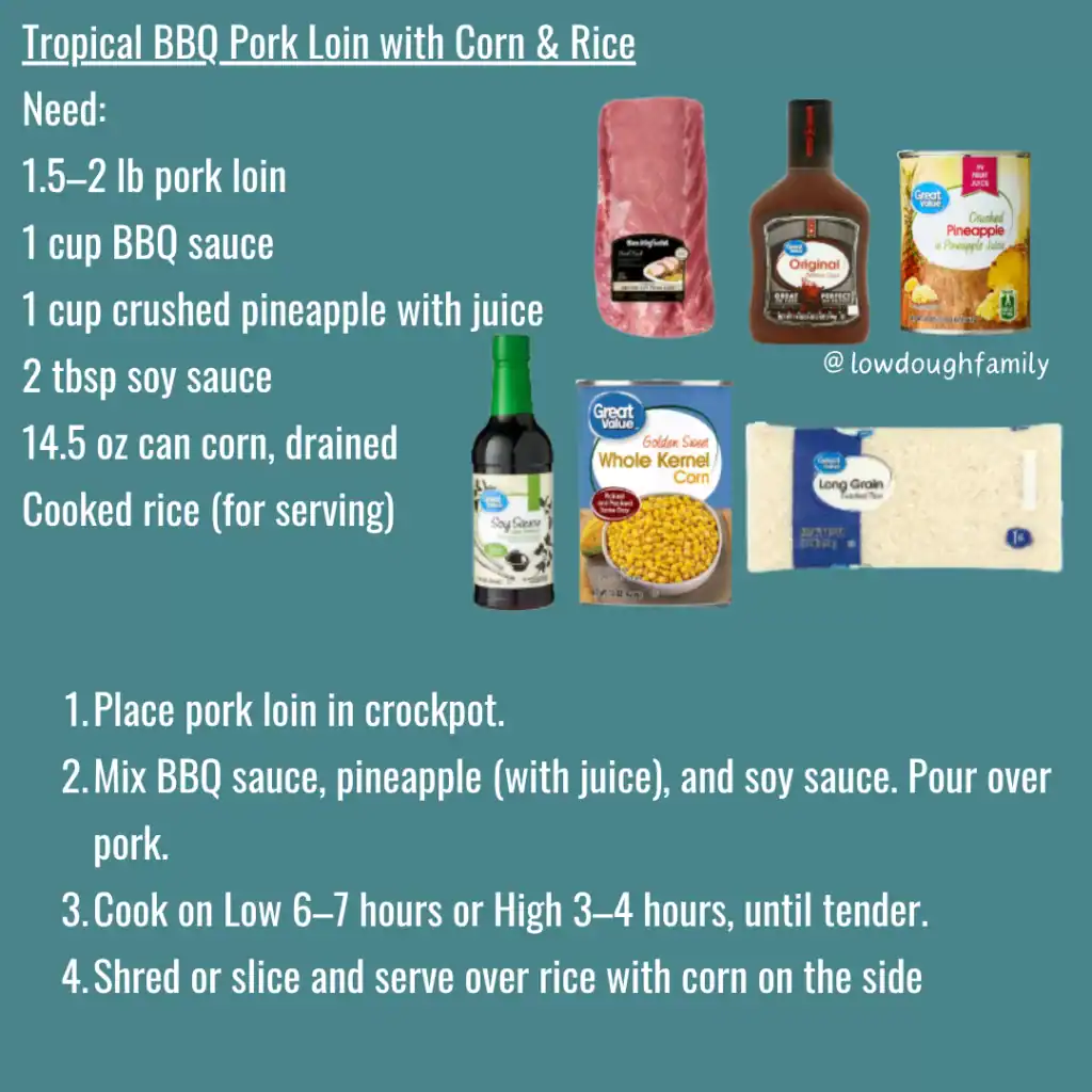 A sweet and tangy mix of BBQ sauce, pineapple, and corn turns this pork loin into an easy island-inspired dinner. Serve it over rice to soak up the extra sauce, or try it with canned peaches instead of pineapple for a fun twist.