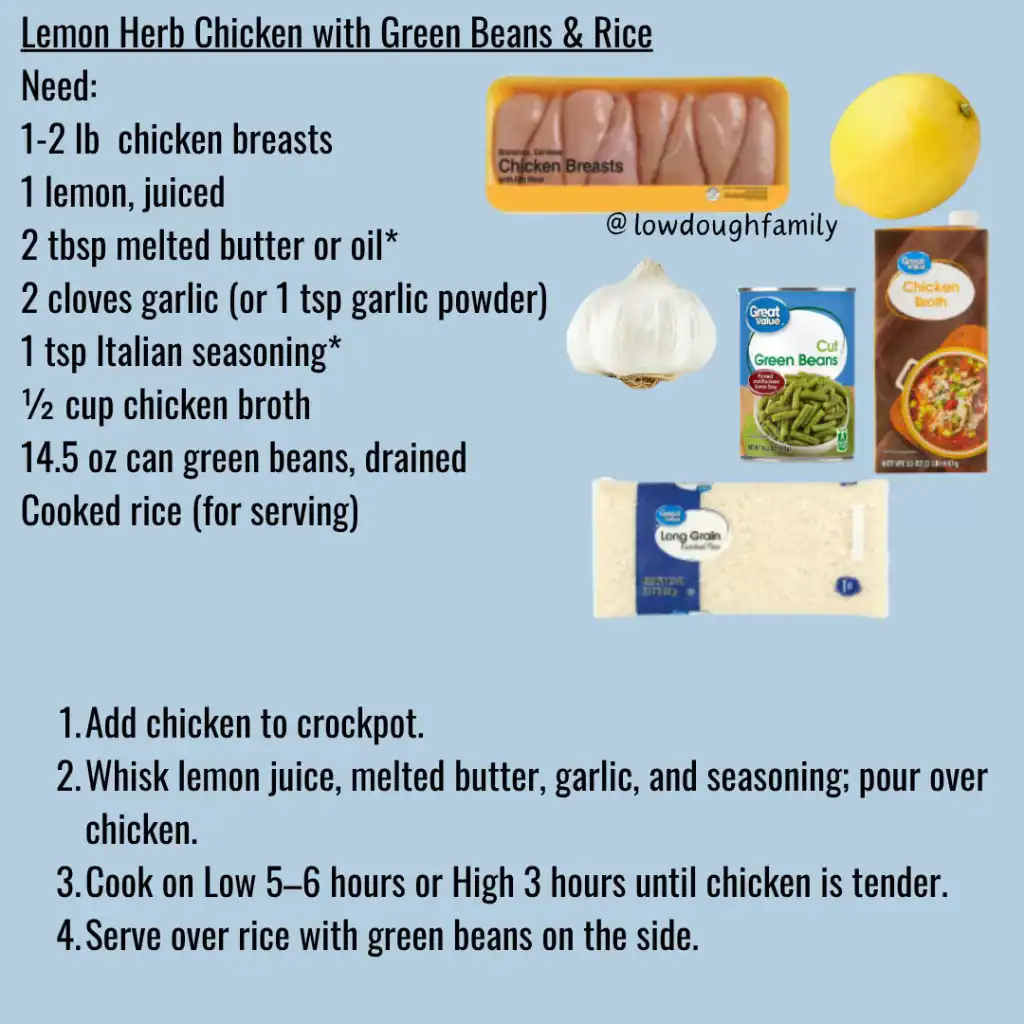 This bright and zesty chicken tastes fresh but still cozy, perfect for those nights when you need something simple. The lemon, garlic, and Italian seasoning pair beautifully with green beans and rice, though you can toss in frozen broccoli or peas if that is what you have on hand.