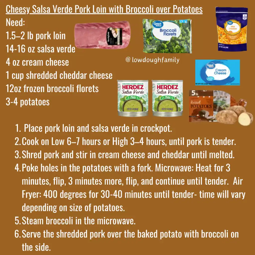 Creamy, zesty, and perfectly mild for the whole family, this salsa verde pork is delicious spooned over baked potatoes. The broccoli adds color and a boost of nutrition, and you can swap in pepper jack or Monterey Jack cheese for more flavor or a touch of spice.