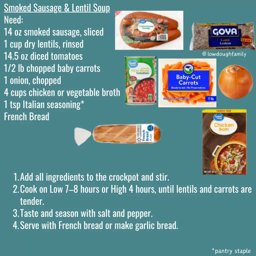 This simple, filling soup is the ultimate dump and go dinner for a busy night. Lentils, sausage, and carrots simmer all day into a rich, cozy meal that only needs a slice of crusty bread or garlic toast on the side. For a colorful twist, stir in a handful of spinach near the end.