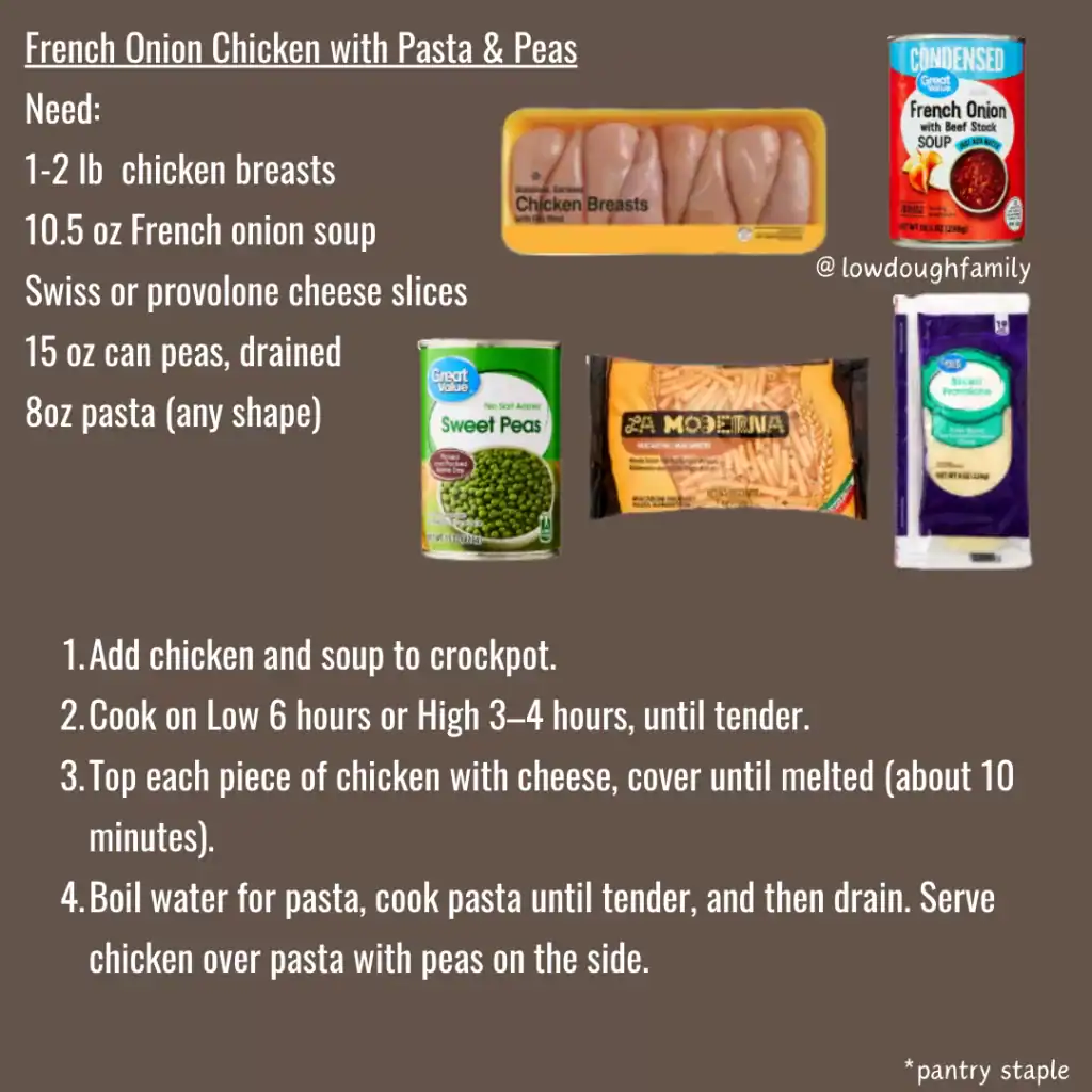 All the cozy flavors of French onion soup turned into a complete dinner. Tender chicken smothered in savory onion gravy and melted cheese makes a comforting, hearty meal over noodles. You can also toss in a handful of mushrooms for extra richness.