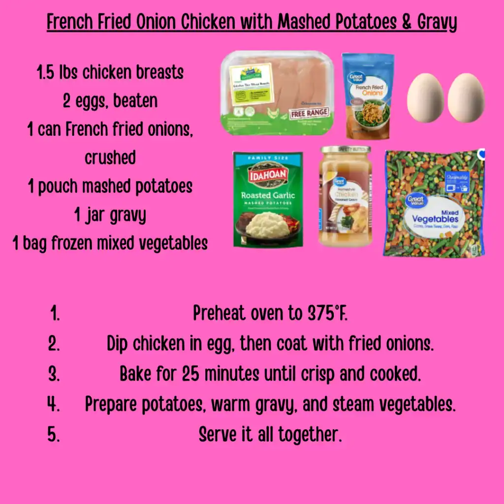 French fried onions make this chicken extra rich and crispy, and it’s right at home next to mashed potatoes and warm gravy. You can use instant or homemade mashed potatoes, and swap the onions for panko mixed with onion powder in a pinch.