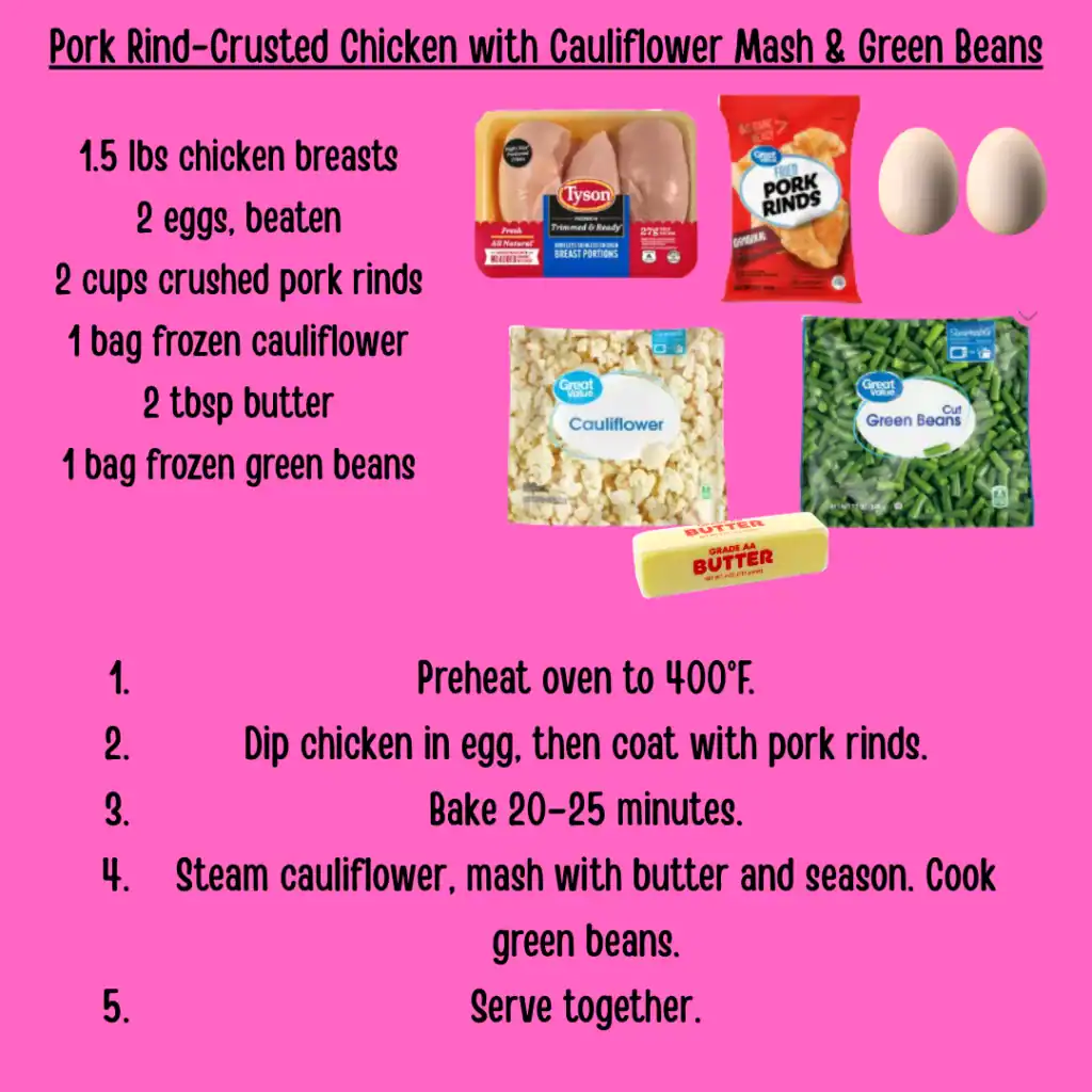 Pork Rind-Crusted Chicken with Cauliflower Mash & Green Beans