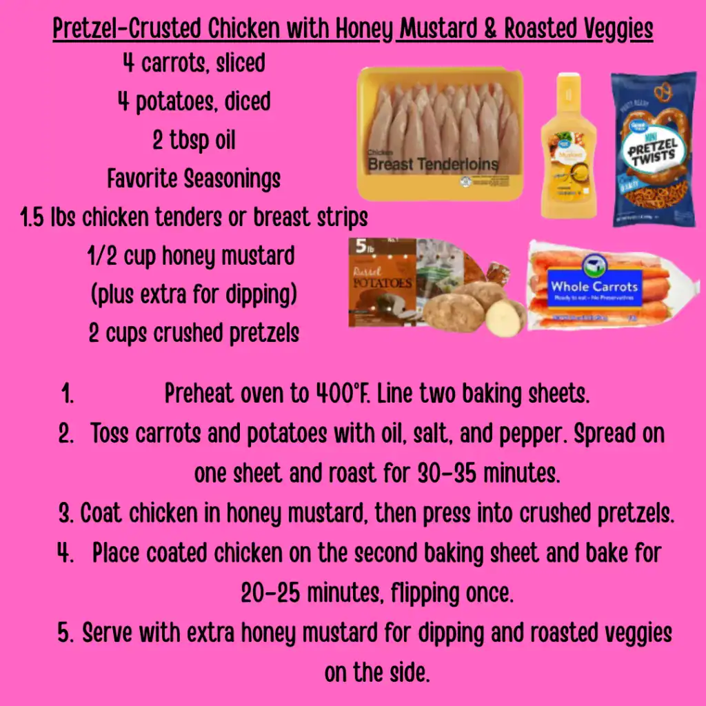Crunchy pretzels and sweet honey mustard make this chicken a flavorful upgrade from plain breading, perfect with roasted carrots and potatoes. You can substitute Dijon or BBQ sauce for the honey mustard or use green beans or sweet potatoes as your side.