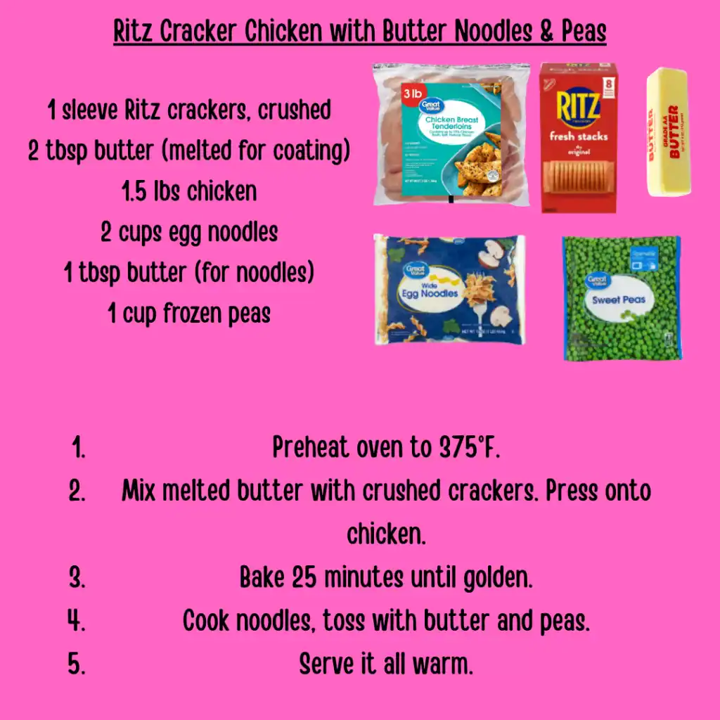 Ritz Cracker Chicken with Butter Noodles & Peas