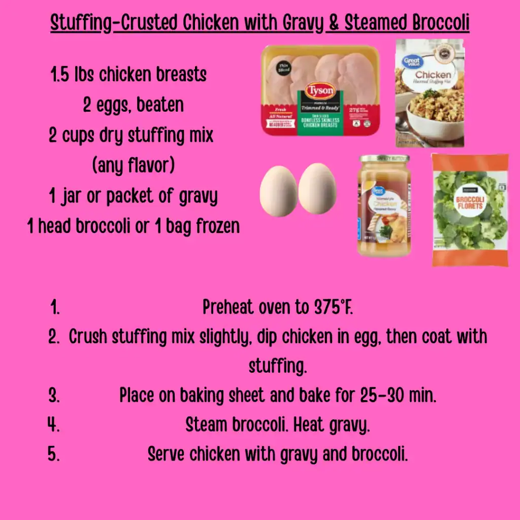 This cozy dinner tastes like a shortcut to Thanksgiving, using dry stuffing mix as the crunchy coating and pairing it with gravy and broccoli. Try it with mashed sweet potatoes or canned green beans if that’s what’s on hand.