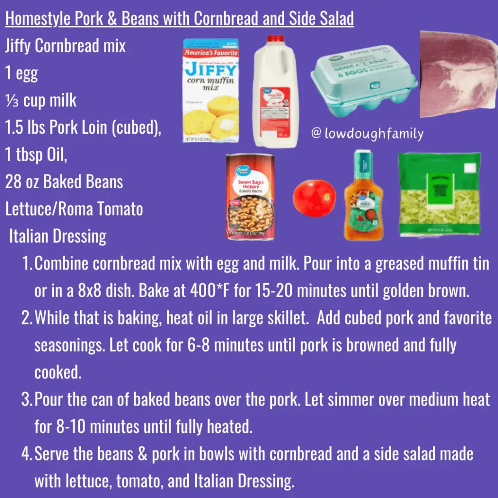 This is a simple, filling comfort meal with hearty pork and saucy beans that pairs perfectly with cornbread. You can swap baked beans for chili beans or BBQ beans, and the pork can be replaced with leftover shredded meat if needed.