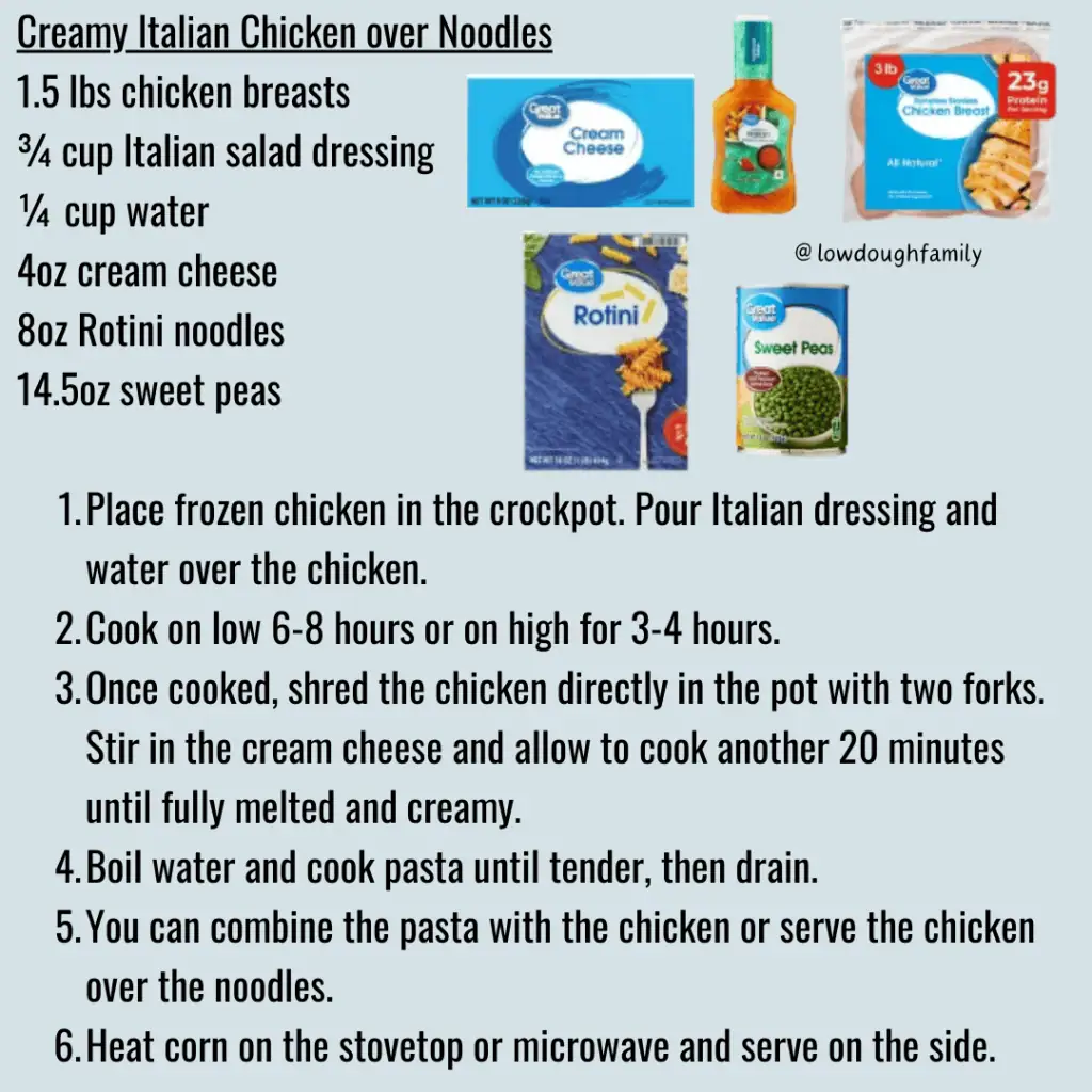Italian dressing creates an easy, tangy sauce that coats the shredded chicken and noodles beautifully. Any short pasta or egg noodles work in place of rotini, and corn or green beans can sub in for the peas without changing the vibe.