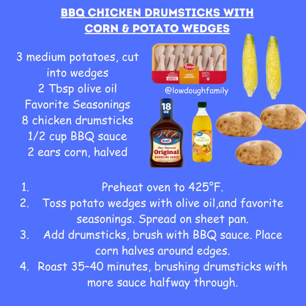 BBQ drumsticks, golden potato wedges, and sweet corn on the cob make this feel like a summer cookout on a pan. No corn? Try frozen broccoli or zucchini instead.