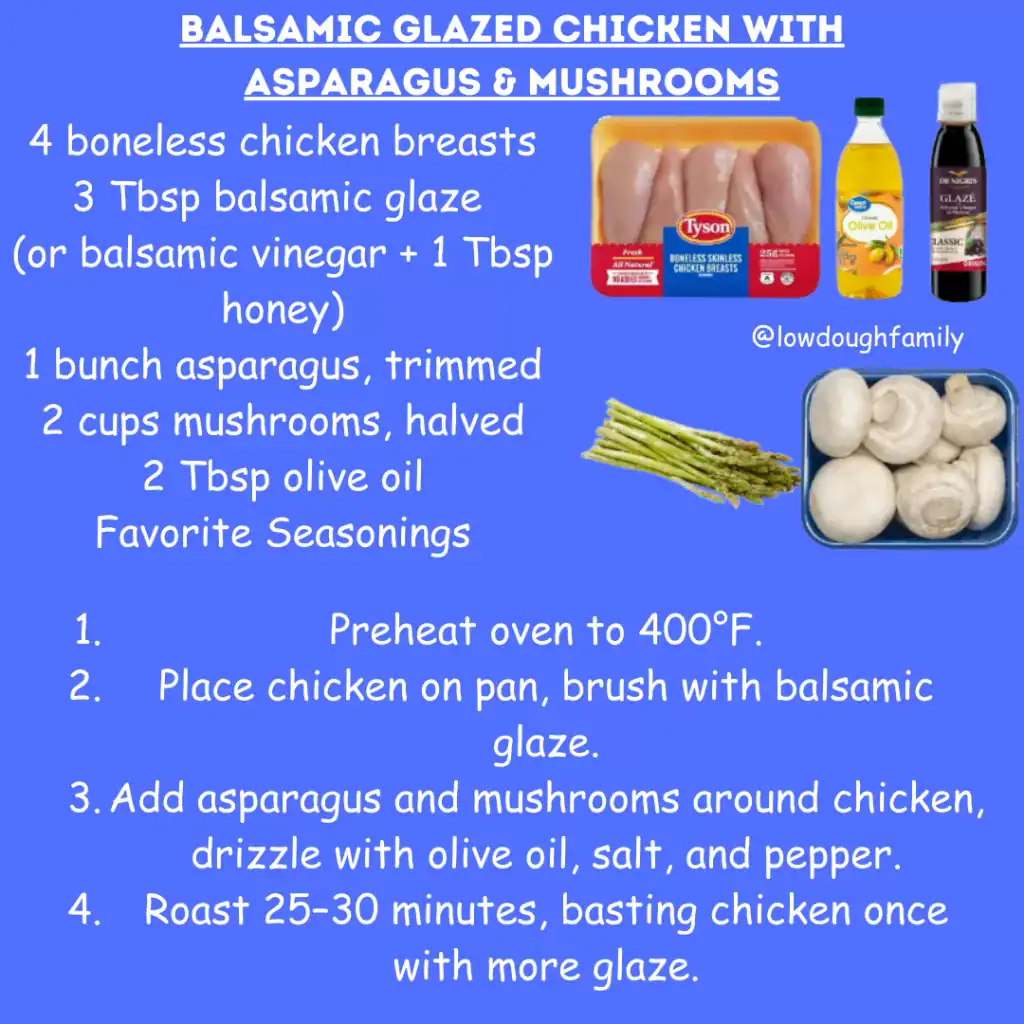 Tangy balsamic glaze gives chicken, asparagus, and mushrooms a rich, restaurant-style flavor. Swap asparagus for broccoli or green beans, and mushrooms can be swapped with zucchini or bell peppers.
