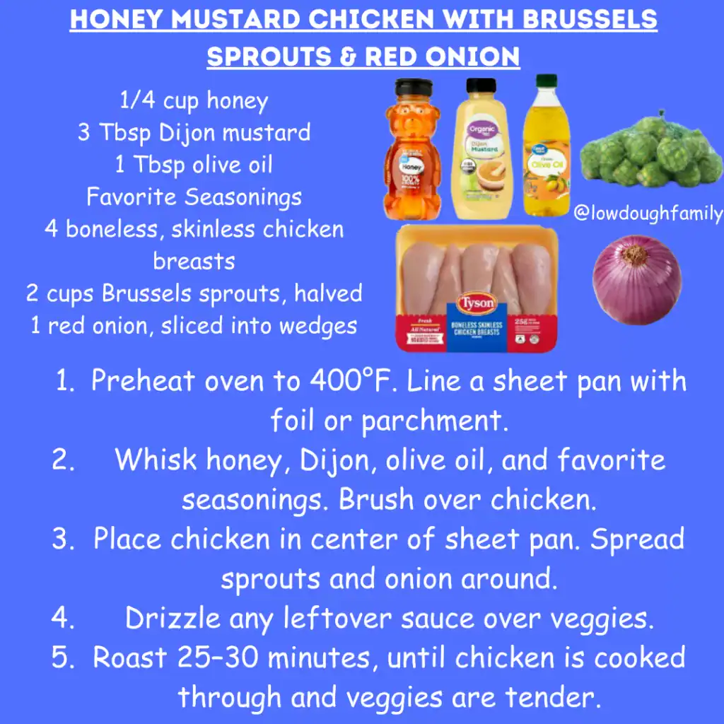 Sweet and tangy honey mustard makes plain chicken breasts taste extra special, while Brussels sprouts and onions roast to perfection. Swap in broccoli, carrots, or even green beans if that’s what you have.