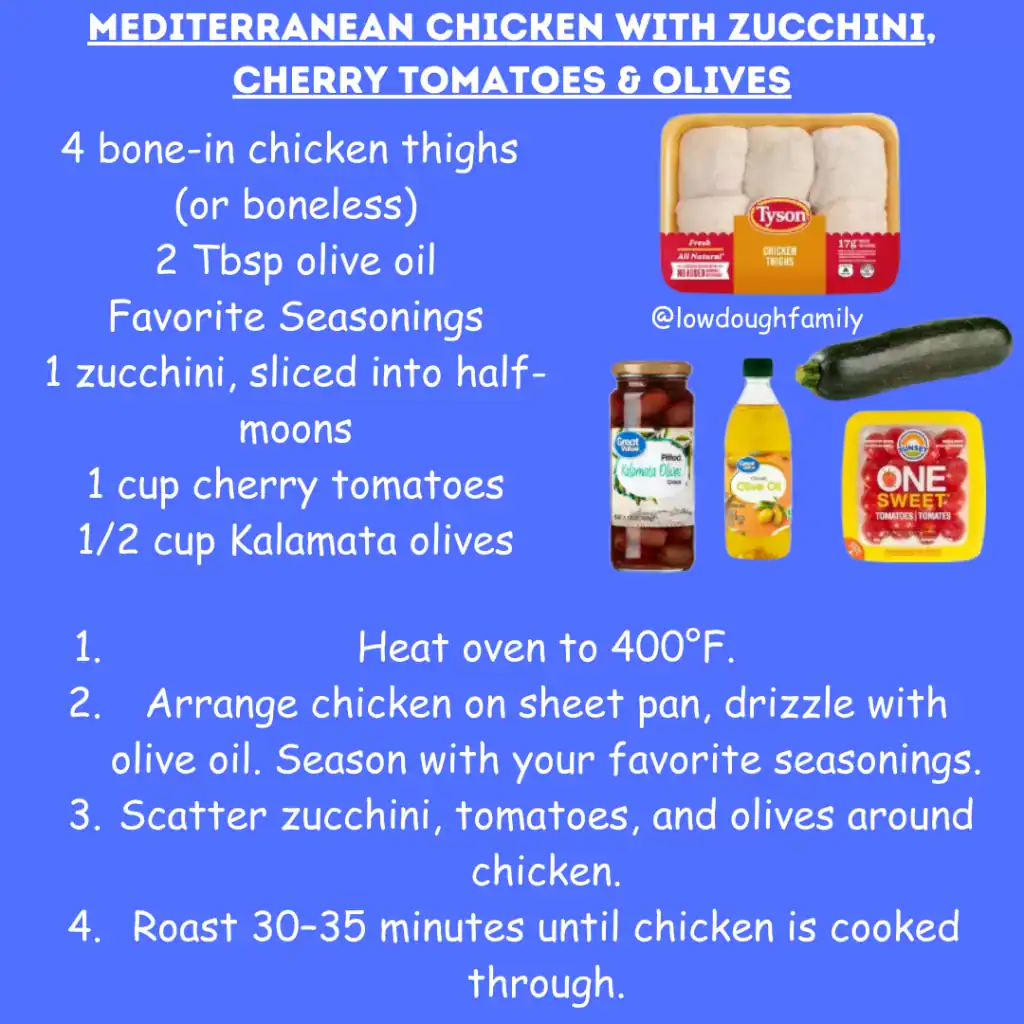 Juicy chicken thighs paired with zucchini, tomatoes, and olives bring big flavor with very little effort. Swap olives for artichoke hearts or roasted red peppers if you prefer.